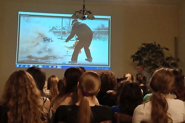 Pan Grzegorz informuje nas o podstawowych zasadach ochrony przeciwpożarowej, zasad postępowania ograniczającego ryzyko wybuchu pożaru, czym co gasimy, zasad szybkiej i bezpiecznej ewakuacji budynku oraz podstawowych zasad bezpieczeństwa. Szkoleniowa ewakuacja z budynku przebiegła szybko i bezpiecznie, nie było żadnych trudności w ustawieniu się piętrami i pokojami.