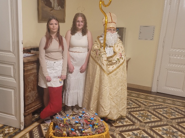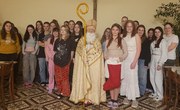 Święty Mikołaj przybył do nas w tradycyjnym biskupim stroju, z uśmiechem na twarzy i koszem pełnym niespodzianek. Asystowało Mu dwóch Aniołów – dziewcząt z Internatu Karolina i Magda. Jego obecność sprawiła, że atmosfera była pełna ciepła i radości. Jednak, jak przystało na biskupa, Mikołaj nie przyszedł tylko z prezentami, ale również z zadaniami, które miały na celu wzajemne dzielenie się wiedzą i umiejętnościami. Dziewczęta zostały poproszone o odpowiedzi na pytania, które miały charakter zarówno edukacyjny, jak i rozrywkowy. Uczestniczki podzieliły się na pary, aby odpowiedzieć sobie na pytania zawarte na wylosowanych kartkach. Po wspólnym dzieleniu Święty Mikołaj nagrodził je upominkami.